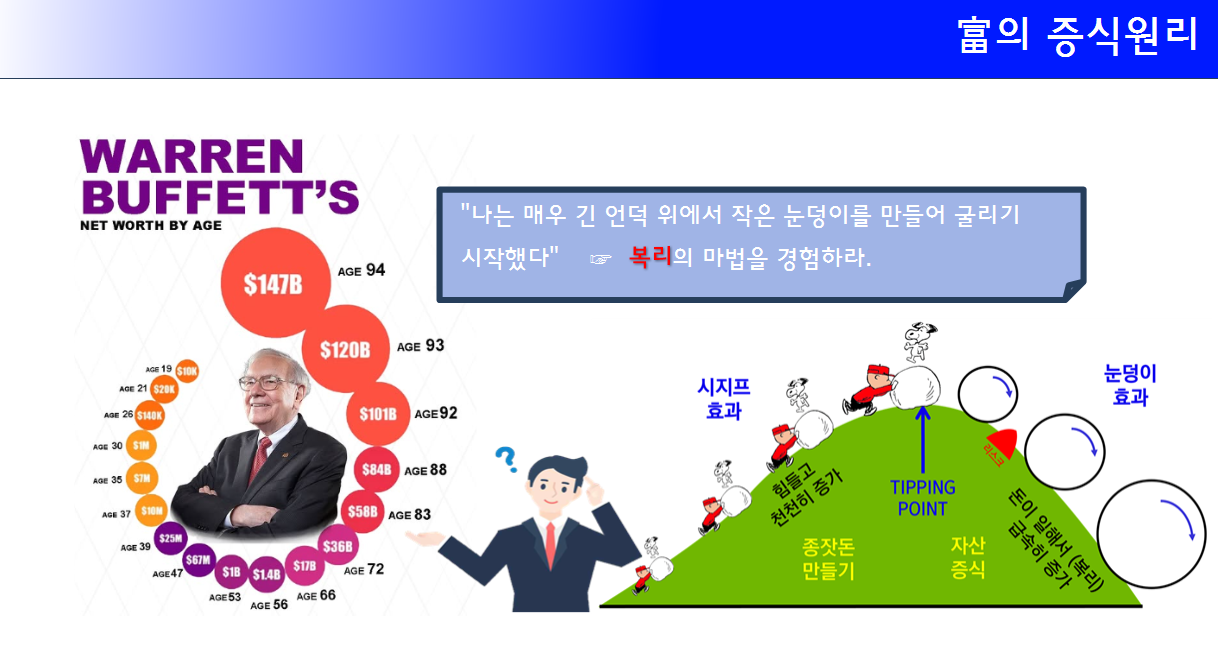 독자들이 복리 저축을 통해 장기적인 부를 어떻게 만들어갈 수 있는지를 쉽게 이해할 수 있도록 강의한 PPT 일부 자료로 구성했습니다.