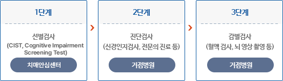 1단계로 치매안심센터에서 치매선별검사를 실시합니다.
