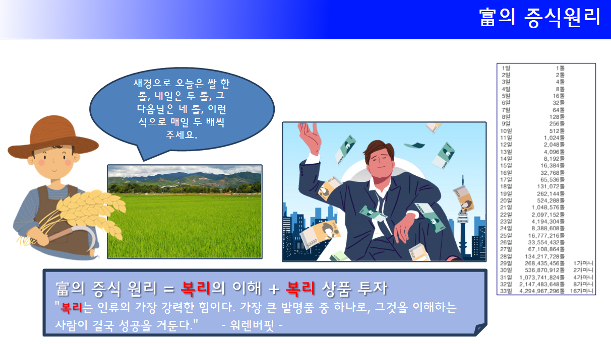 1일 노자 돈 쌀 1톨 받는 농부가 다음 날 쌀 2톨, 4톨, 8톨, ....